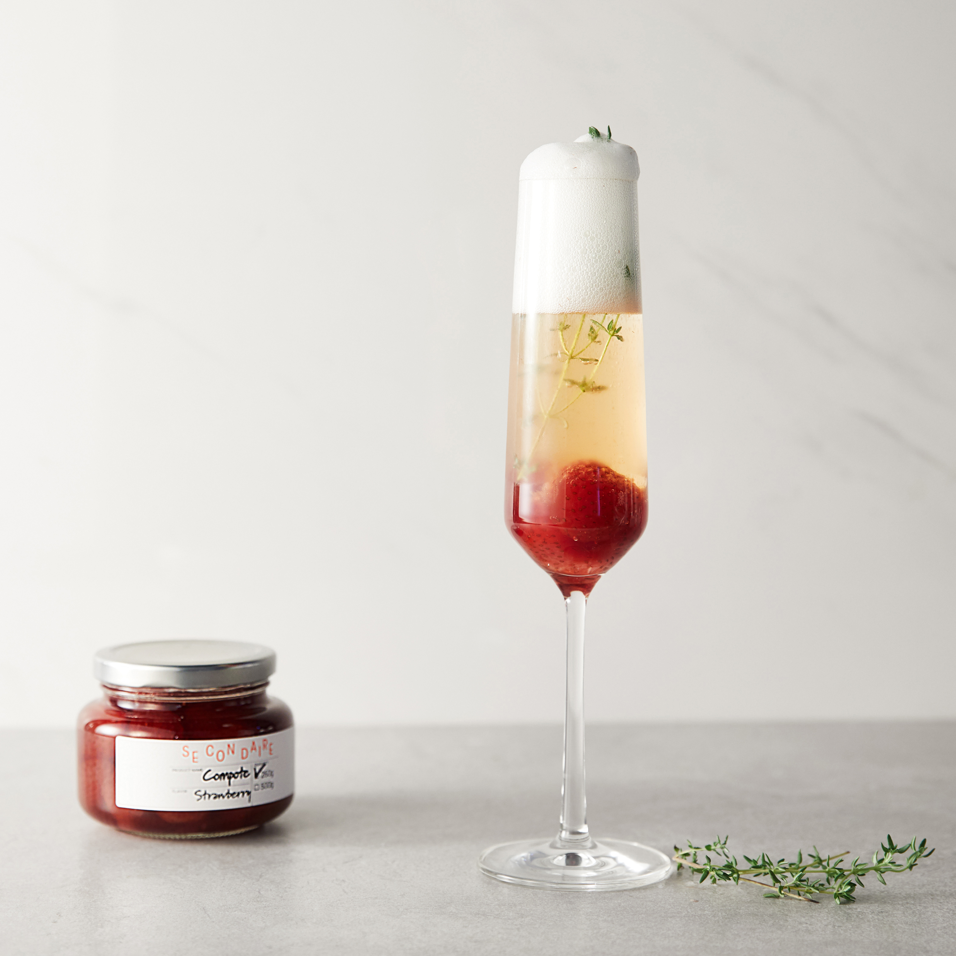 Strawberry Cocktail 1) Please prepare compote and unsweetened sparkling wine.2) Place the compote in a glass and pour in the sparkling wine. At this point, the ratio of compote to wine should be approximately 1 part compote to 5 parts wine.(TIP: Adding herbs deepens the flavor.) Secondaire Youtubehttps://www.youtube.com/channel/UCD3YnTfukIT04LvaA8CK-PA Secondaire Instagramhttps://www.instagram.com/secondaire_official/ - A catalyst for you - 당신의 즐거운 미각을 경험하세요.