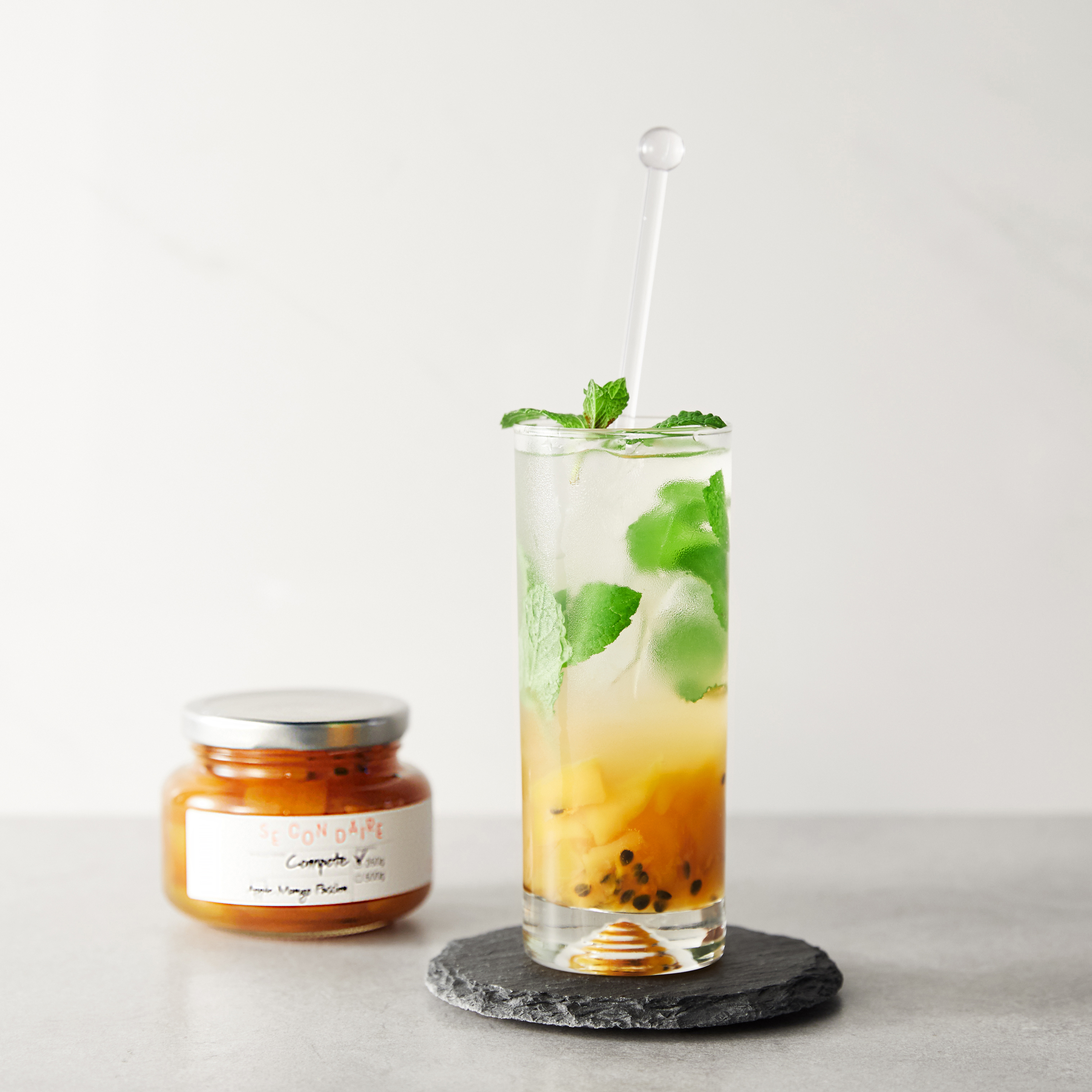 Mango passion Ade [Ingredients]Apple Mango Passion Compote, Sparkling Water, Apple Mint Leaves 1) Fill a chilled glass with ice.2) Place the compote in the glass and pour in the sparkling water. At this point, the ratio of compote to sparkling water should be 1 part compote to 3 parts sparkling water.3) Add fresh apple mint leaves to enjoy a subtle aroma and flavor.(TIP: You can enjoy the Seconde Ade even more by preparing your preferred herb leaves according to your taste.) Secondaire Youtubehttps://www.youtube.com/channel/UCD3YnTfukIT04LvaA8CK-PA Secondaire Instagramhttps://www.instagram.com/secondaire_official/ - A catalyst for you - 당신의 즐거운 미각을 경험하세요.